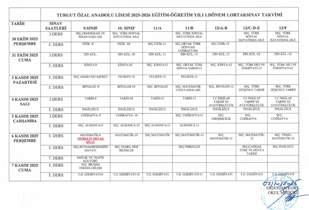 2025-2026 Eğitim Öğretim Yılı 1. Dönem 1. Sınav Takvimi
